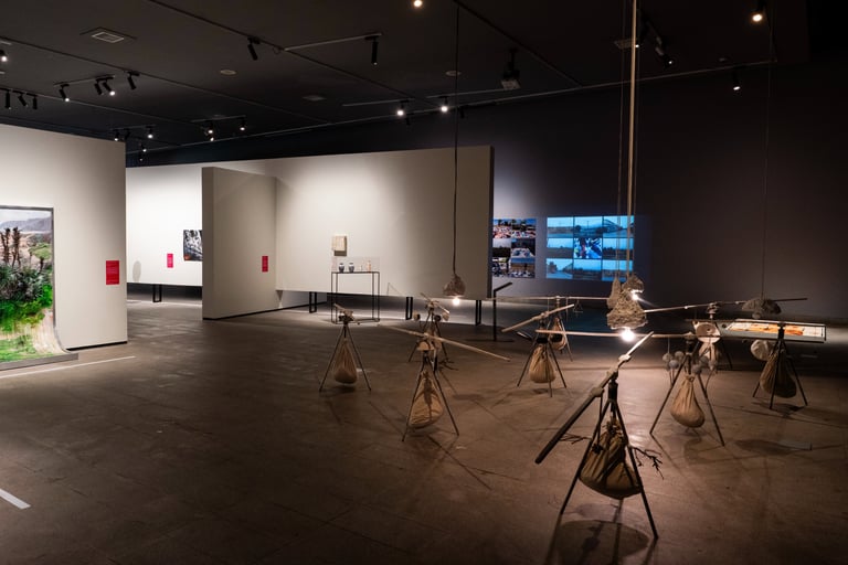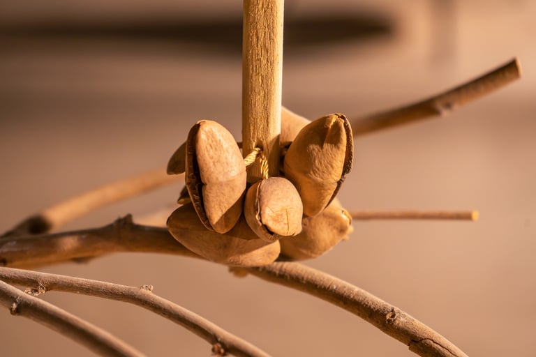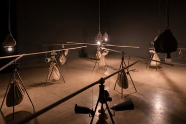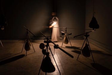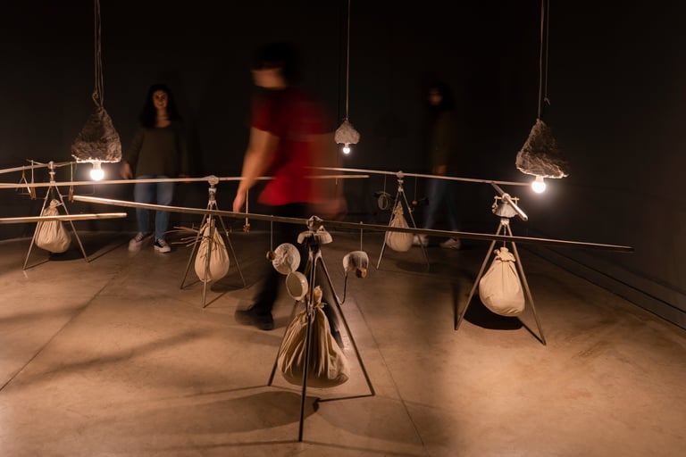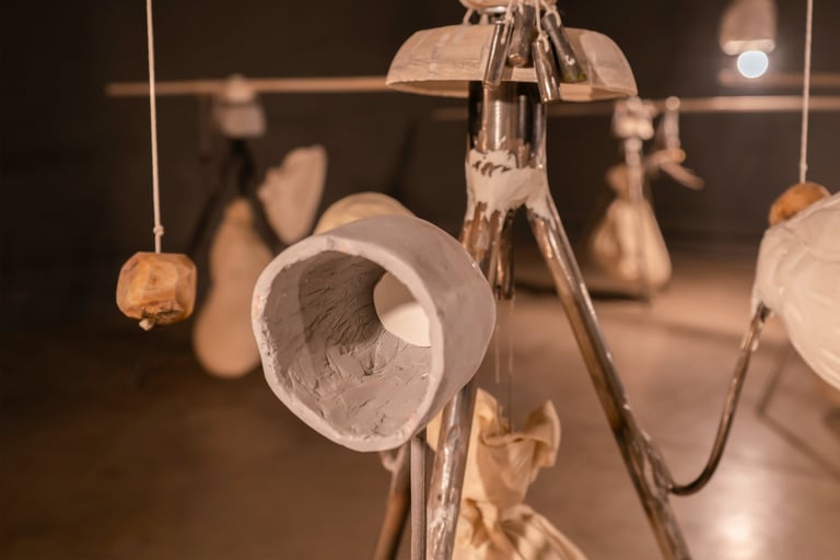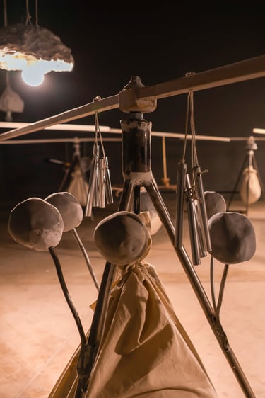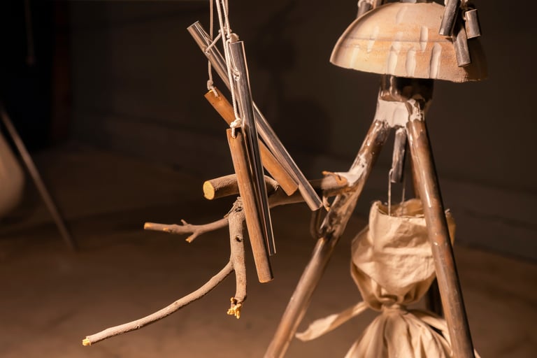 Each piece in the installation consists of a metal base and a wooden bar, with varying sound objects attached—ceramic bowls, wooden branches, steel tubes, stones, and other elements inspired by Latin American percussion instruments such as cowbells, chajchas, and triangles. These elements evoke the organic nature of relationships and the way musical ensembles and orchestras coordinate to create harmony.