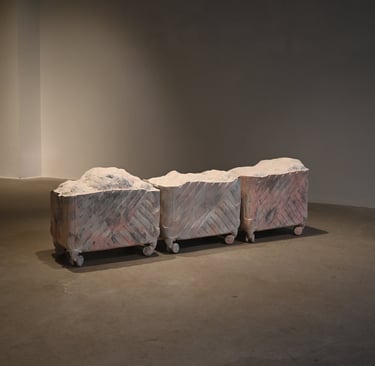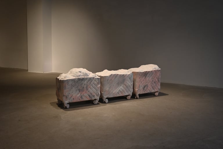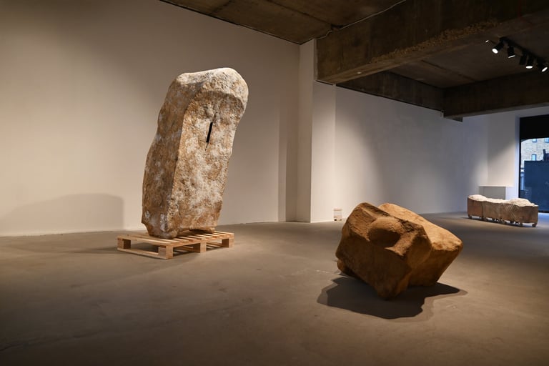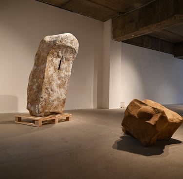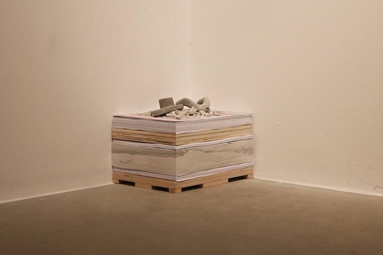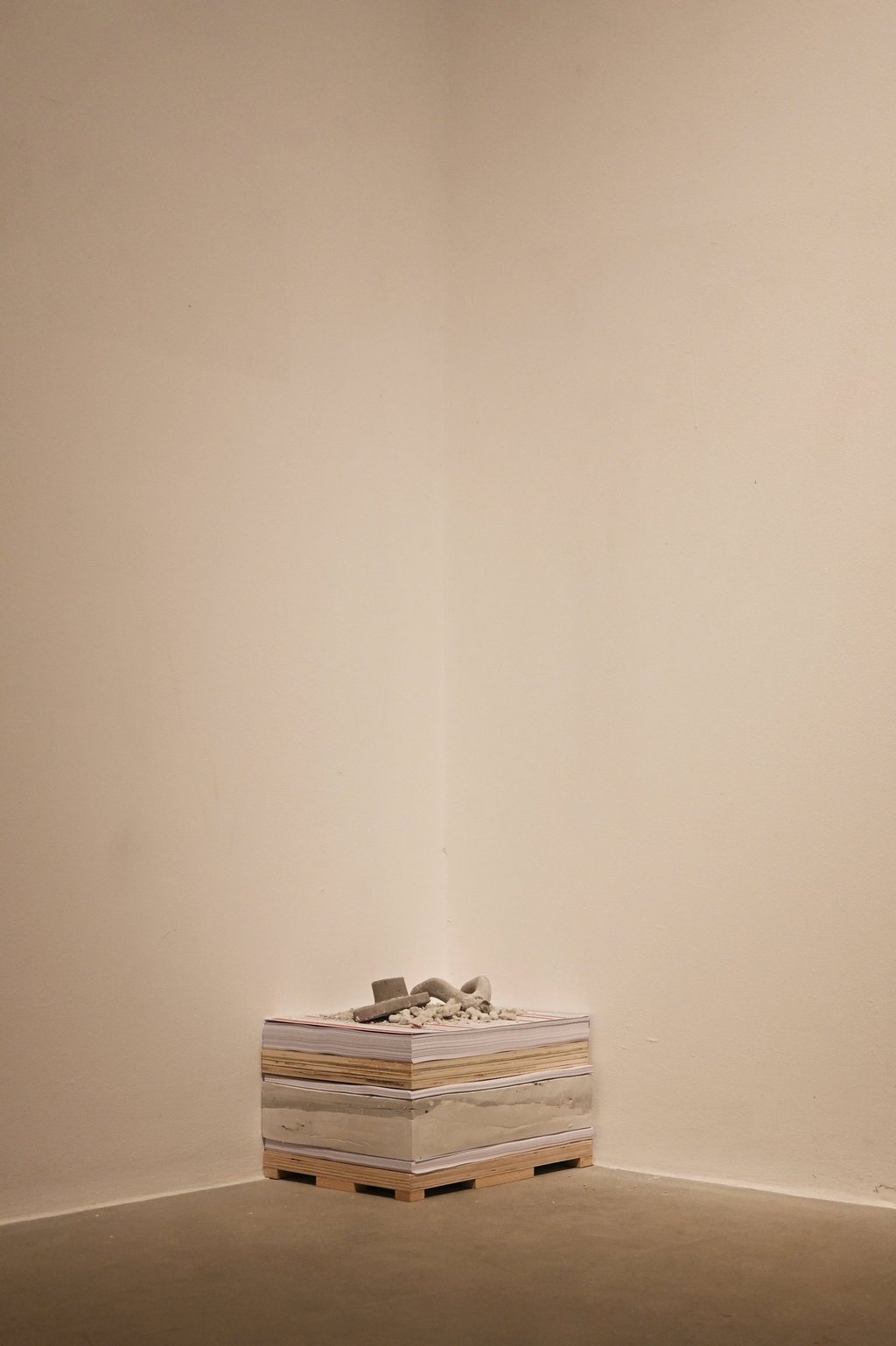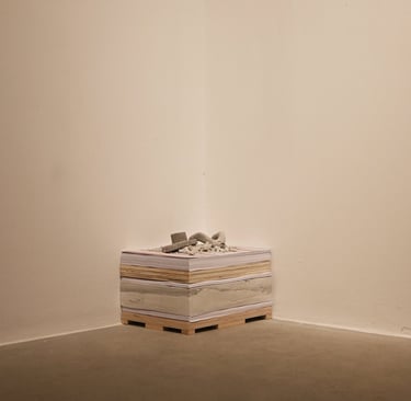 The installation is made of recycled cardboard boxes from international shipments. Originally designed as a work meant to be sent, the sculptures are simultaneously a body, a cardboard box, and a rock, alluding to their impossibility of being shipped. In this way, they become part of a kind of failed relational art.