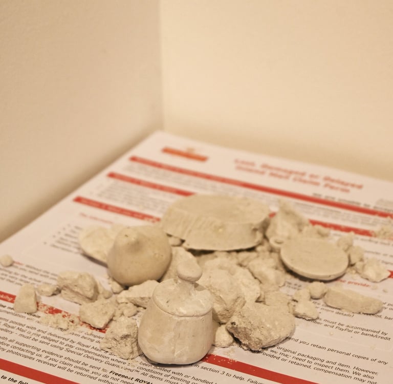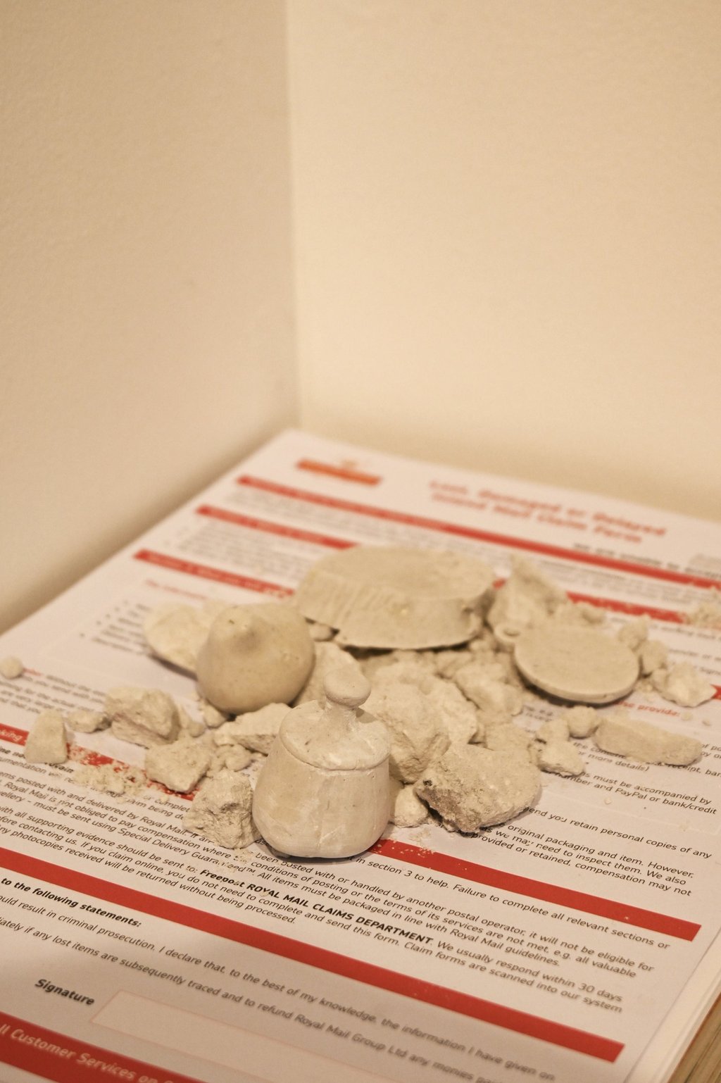 The second sculpture is the mold of the wheel from the same sculpture, placed on a pile of lost item complaint forms from Royal Mail.