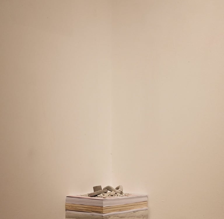 Luego hay dos esculturas. La primera es una obra creada a partir del molde de la maleta que usé cuando migré de Chile. Esta se presenta como una roca, para hacer alusión al peso de las cosas que cargamos cuando nos movemos de un lugar a otro. Al mismo tiempo, la parte superior hace alusión a la cordillera de los Andes, con una vista similar a la que tenía cerca del lugar donde vivía en Santiago.