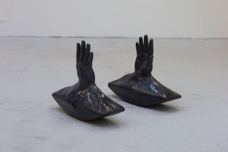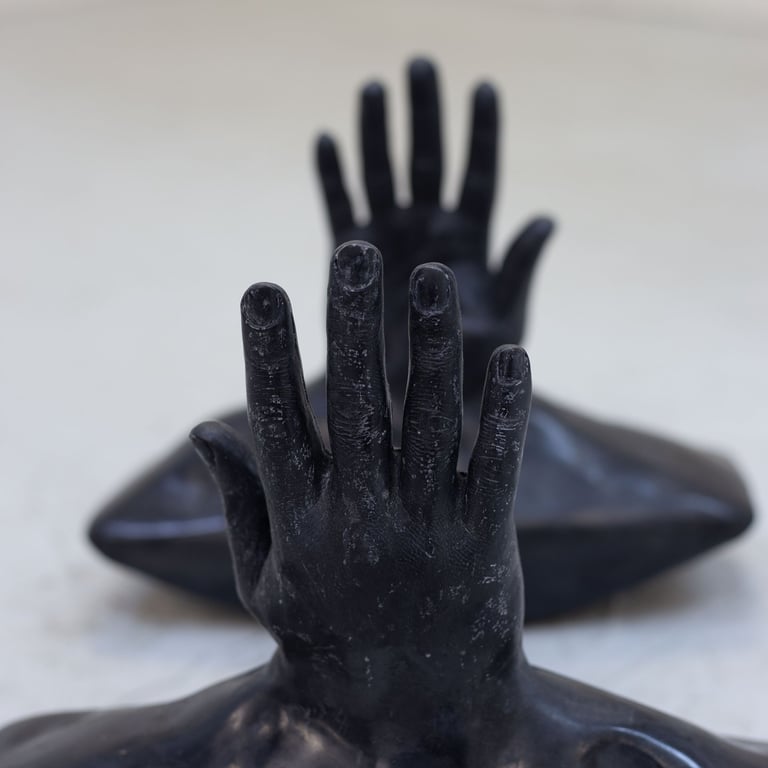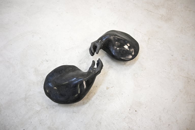 The sculptures represent the importance of body language as a form of communication when two people do not share the same spoken language or when, for some reason, verbal communication fails, and we resort to our bodies to establish gestures or point, creating an intercorporeal connection. These pieces also acknowledge that such moments of communication and miscommunication generate a fiction between two bodies—one that is interpreted in an attempt to reach understanding. As expressed in the poem Not Waving but Drowning, sometimes we understand each other, while at other times, images or bodies are misread.