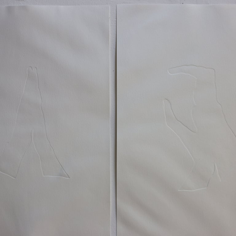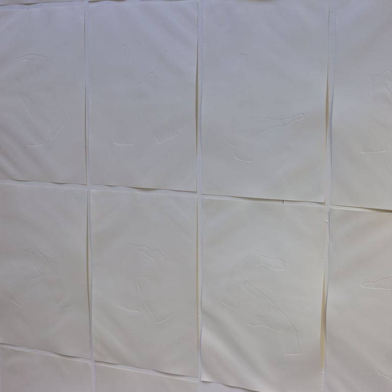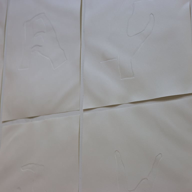 Similarly, the embossed prints present an alphabet in which each letter is formed by hands. Each letter is printed on paper, creating the illusion that it was made by the imprint of two hands pressing firmly onto the surface. In this way, hands once again become essential for grasping language, emphasizing that understanding does not rely solely on recognizing letters but also on feeling them. At the same time, this alphabet functions as a tool—a reminder of the possibility of learning a new language through touch.