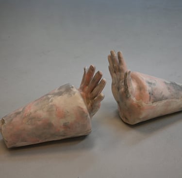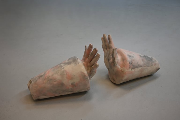 The sculptures represent the importance of body language as a form of communication when two people do not share the same spoken language or when, for some reason, verbal communication fails, and we resort to our bodies to establish gestures or point, creating an intercorporeal connection. These pieces also acknowledge that such moments of communication and miscommunication generate a fiction between two bodies—one that is interpreted in an attempt to reach understanding. As expressed in the poem Not Waving but Drowning, sometimes we understand each other, while at other times, images or bodies are misread.
